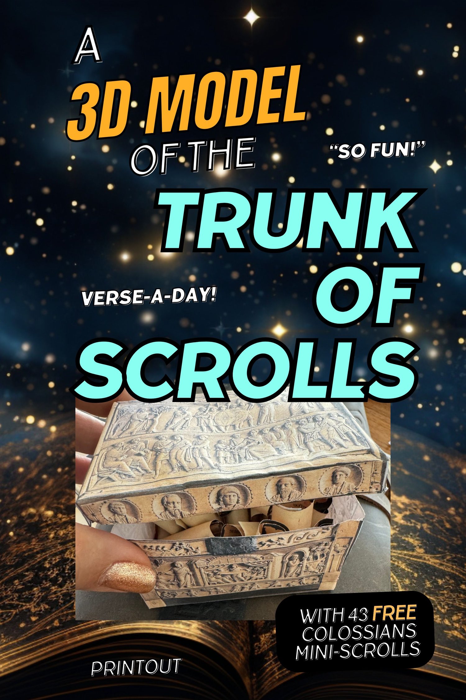 A Must-have for every reader. There is nothing like a model of the Trunk of Scrolls, complete with mini-scrolls with every verse in Colossians that you can include. Use the Trunk to read a passage from Colossians anytime. Add your own verses. Live the experience with Byziana and Marcellus. Super high quality images of the Brescia Casket, after which the Trunk of Scrolls was modeled. Perfect for homeschool arts/craft integration. Comes with an easy version and a complex version of the Trunk. Ages 5-99.